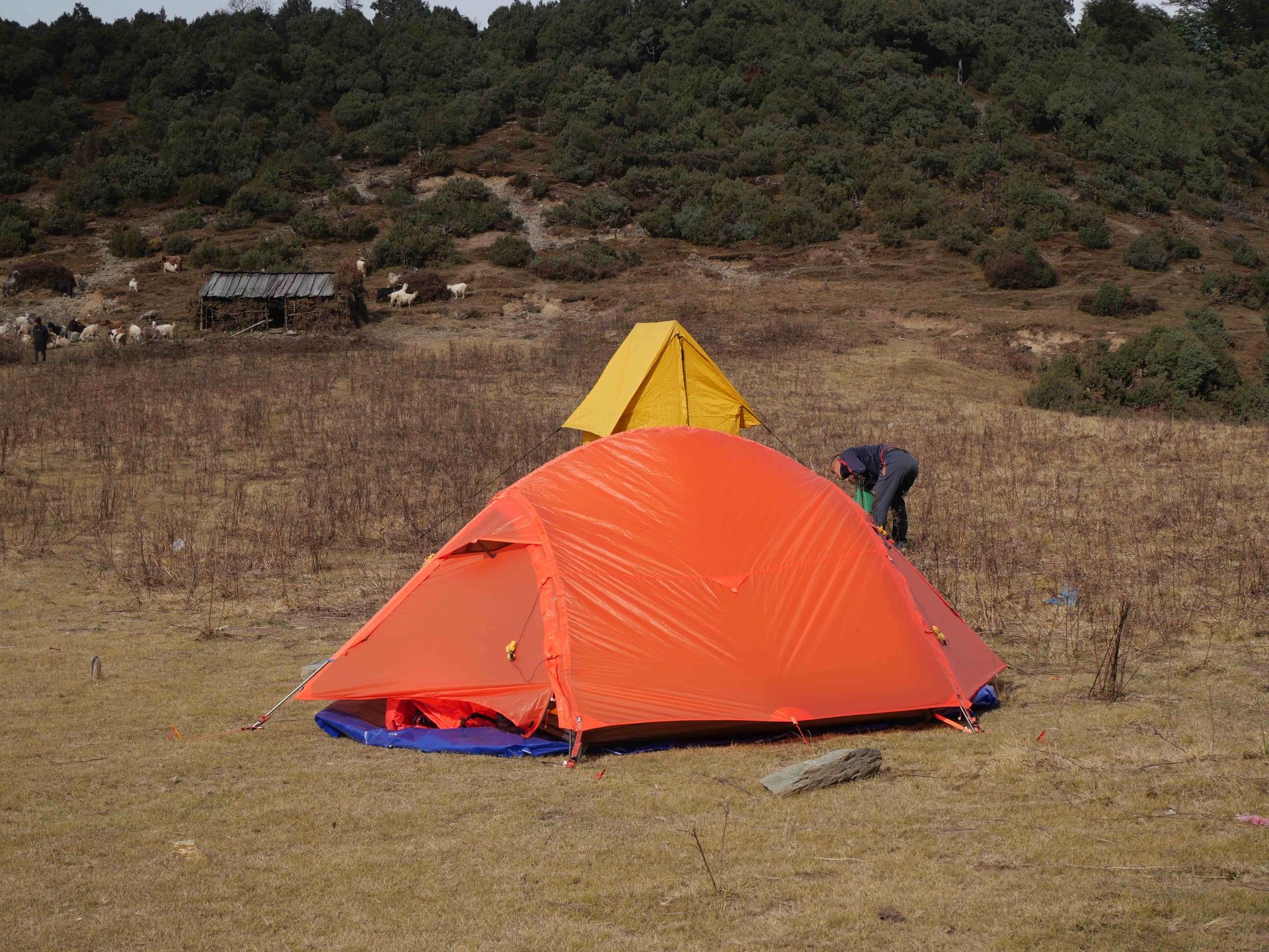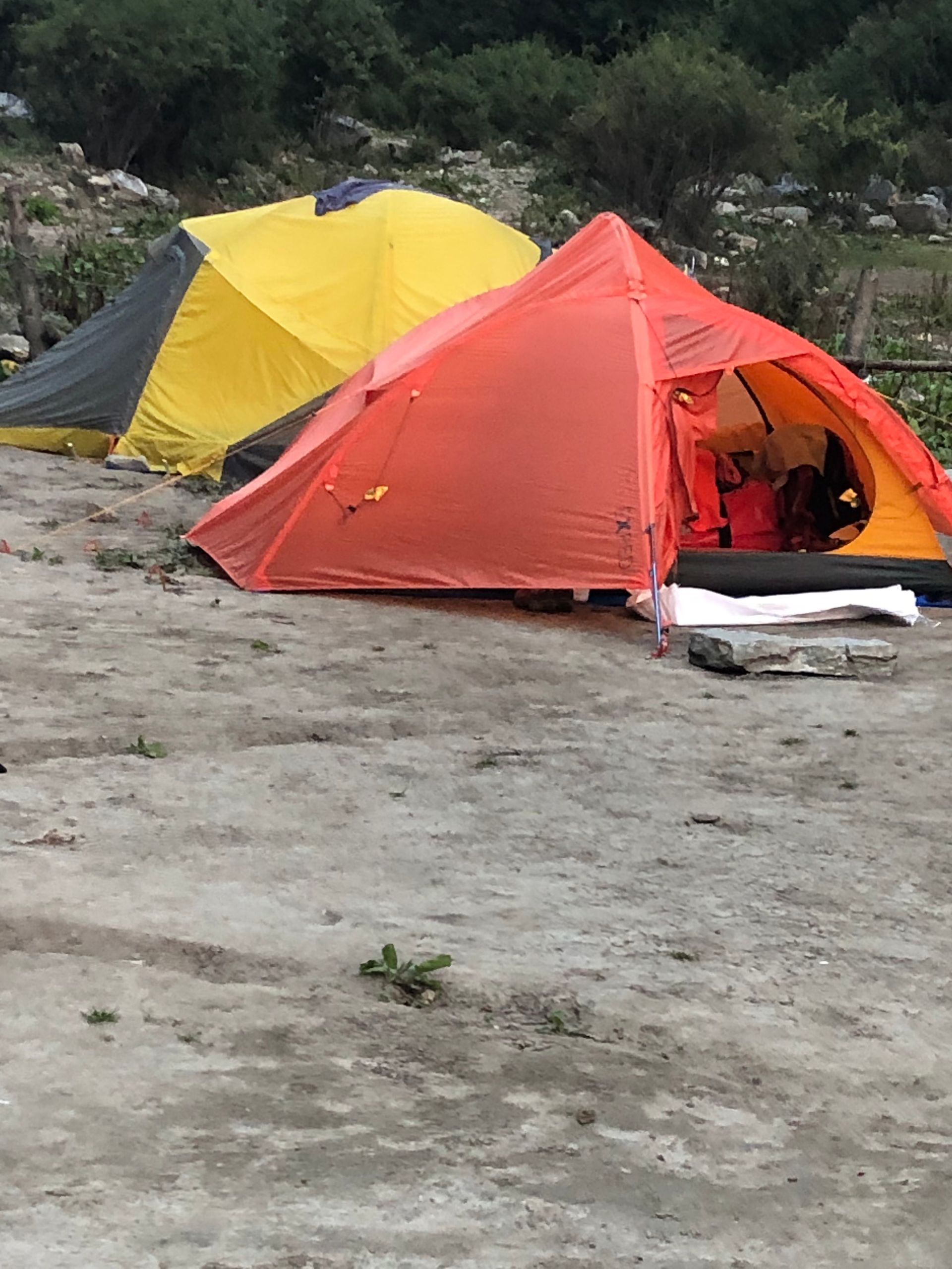 Am Nachmittag nach dem Aufbau der Zelte zogen dichte Wolken auf, und die Reisenden kamen in Genuss von Gewitter mit Schneesturm. Nach eine halben Stunde war das vorbei, die eigentlich schöne Aussicht auf die Berge konnte trotzdem nicht genossen werden. Die Nacht war dann sehr kalt.