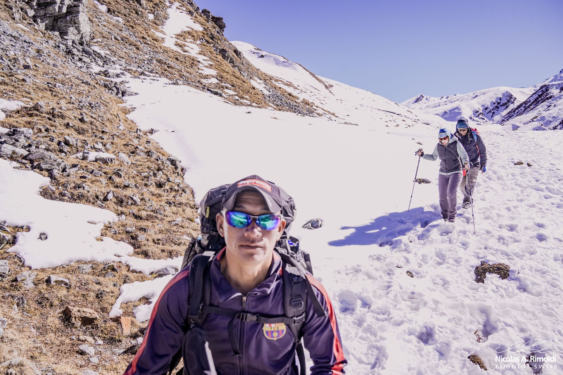 Mit dem Wetter hatten wir unerhörtes Glück, jeden Tag blauer Himmel, strahlende Sonne, nie Regen oder gar Schnee und so war der Weg relativ einfach zu finden. Dies betrifft nur den Weg, galt es doch zwei Pässe (5800 m und 5640 m hoch) zu überwinden. Alle, aber auch wirklich alle inklusive der Nepali-Mannschaft bekam die Höhe zu spüren, aber glücklicherweise wurden wir alle von Höhenkrankheit verschont.